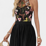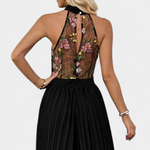 - Parte superior tipo halter con encaje floral semitransparente que realza el torso