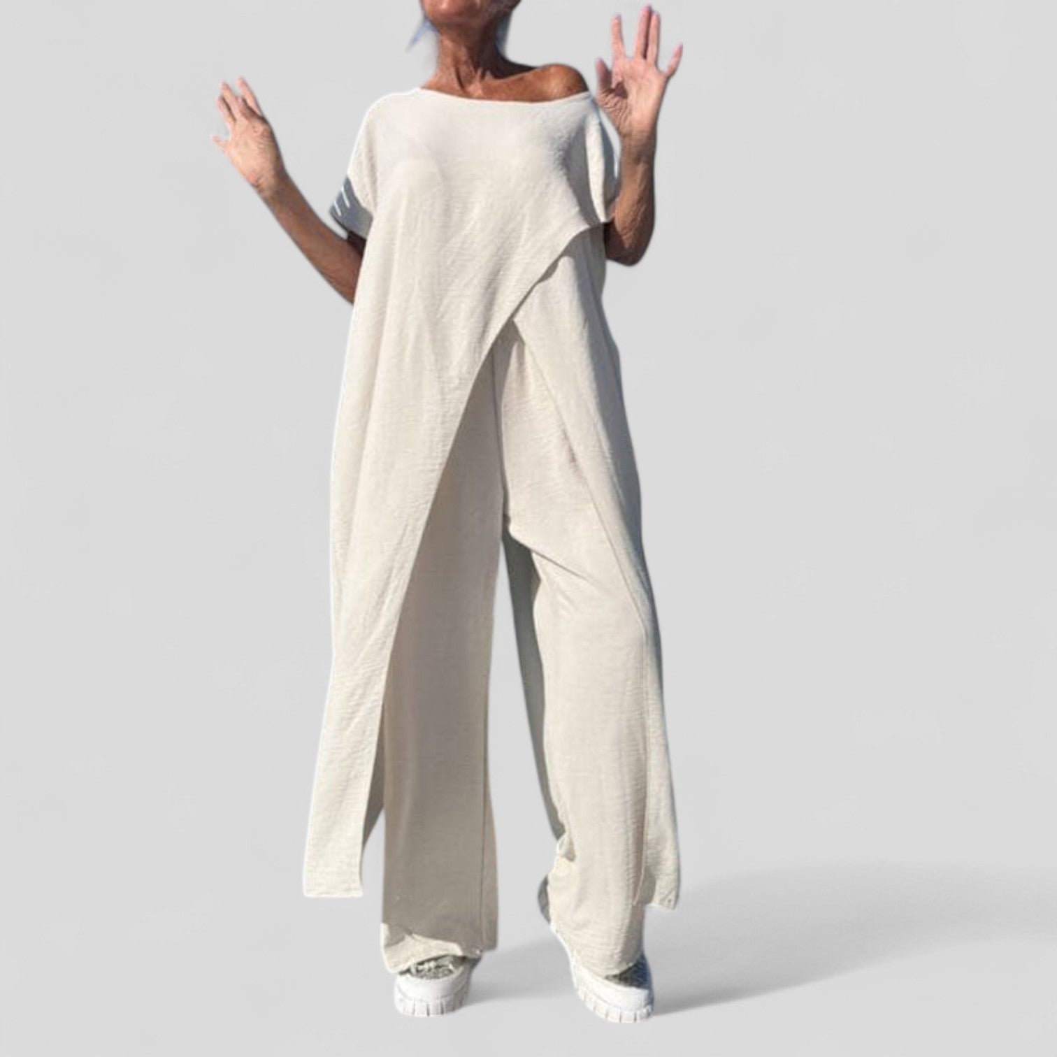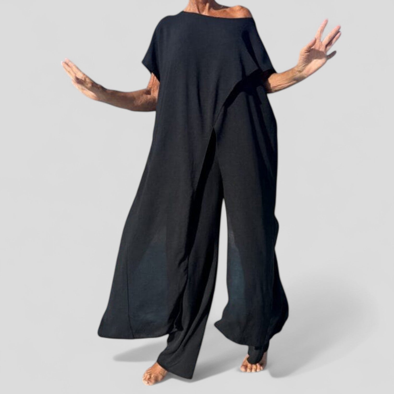 Este mono ofrece máxima libertad con mínimo esfuerzo. El corte asimétrico y la pierna ancha lo hacen ideal para días relajados.