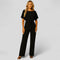 Elegante mono con una silueta fluida y un corte favorecedor que resalta la figura de manera sutil. La parte superior presenta un escote amplio y mangas cortas que caen sueltas, ofreciendo máxima comodidad. El cinturón ajustable define y realza la cintura, permitiendo un ajuste personalizado. Las piernas anchas del pantalón alargan visualmente las piernas, brindando una ligereza aireada.