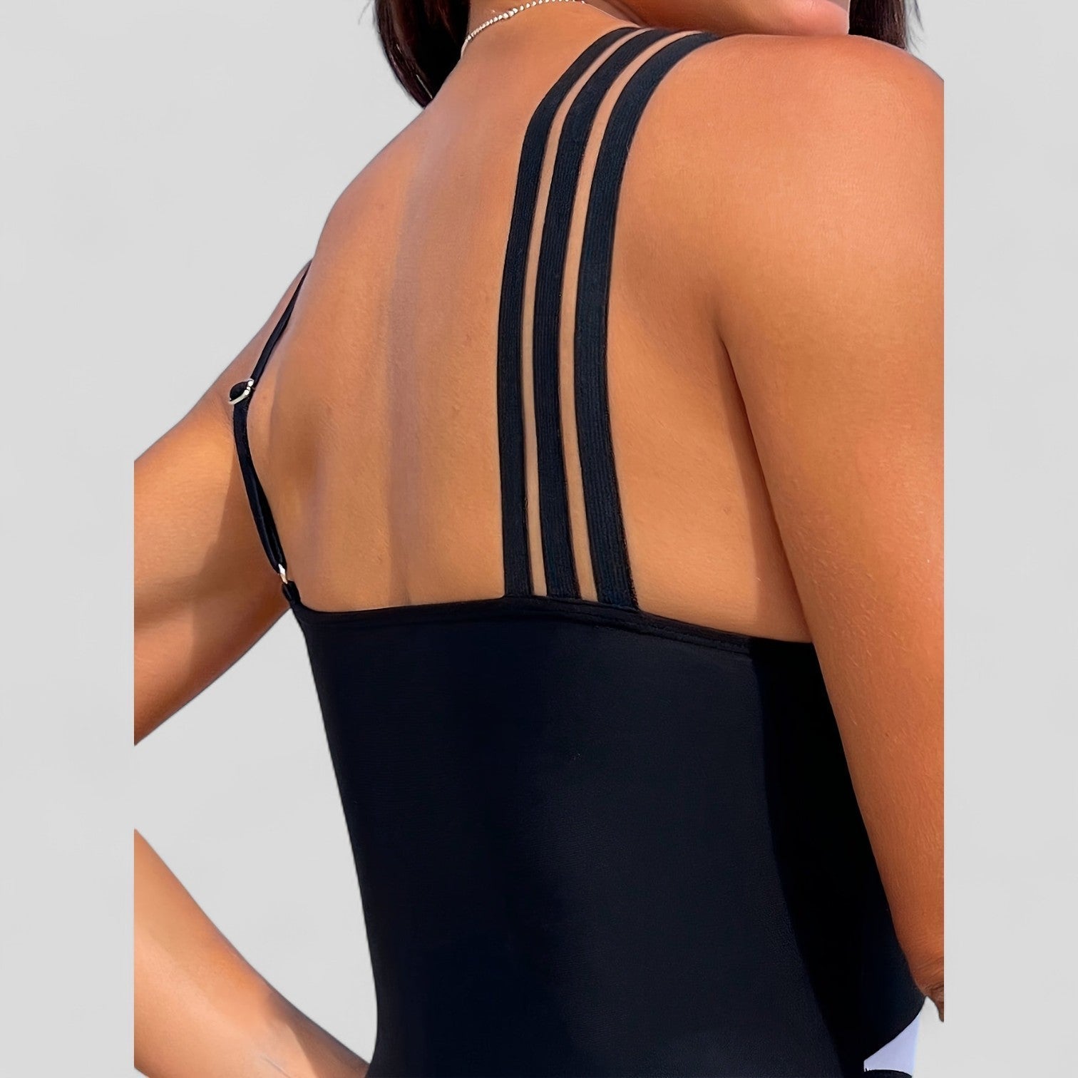 Traje de Baño Moldeador con un diseño de color asimétrico que estiliza la figura. Disfruta de sus tirantes anchos y paneles de malla transparente en la cintura que añaden un toque único y sofisticado.