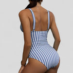 El escote en V y el cinturón definen la figura, mientras las rayas aportan un aire fresco y deportivo.
