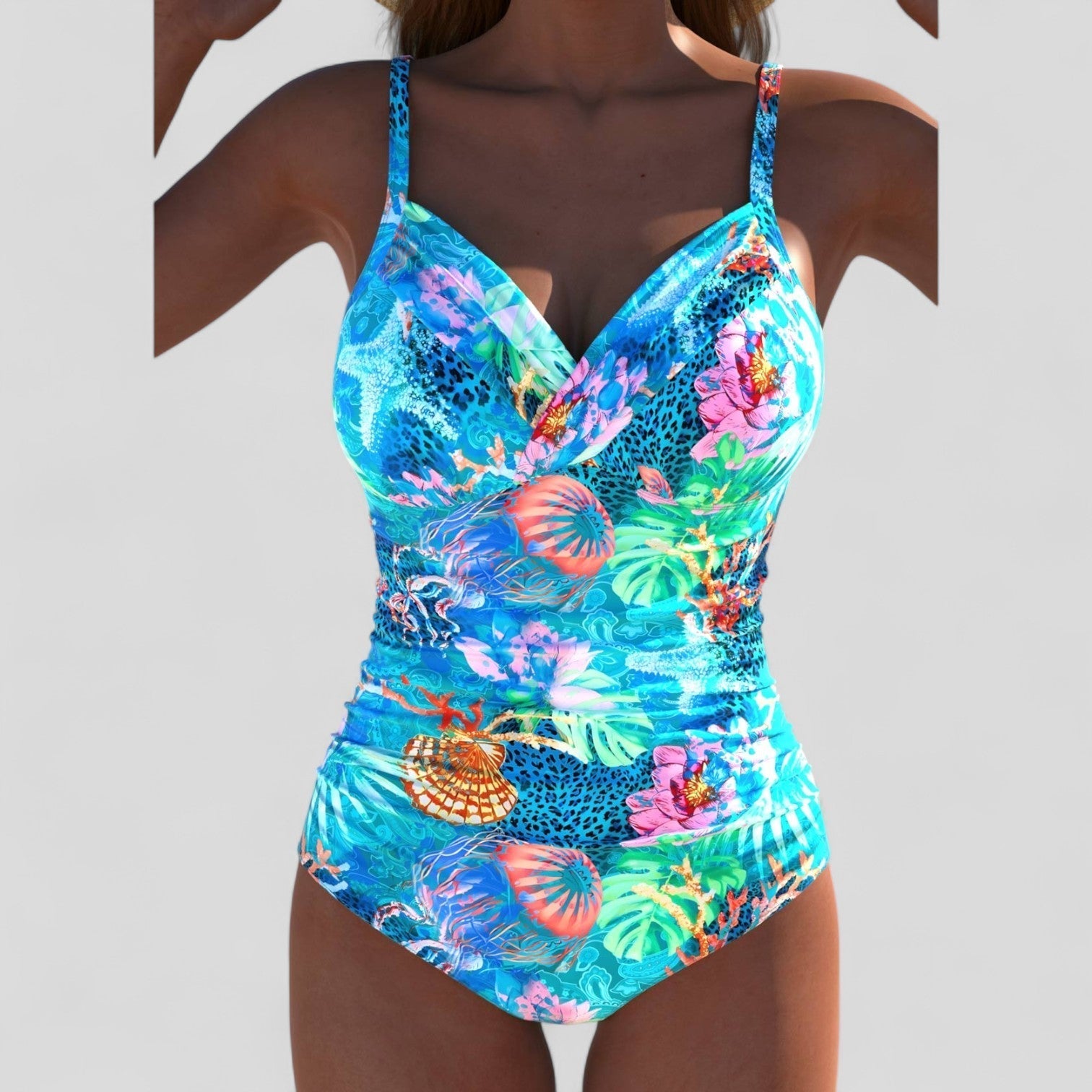 Traje de baño moldeador con estampado tropical: un diseño elegante con escote sofisticado.