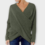 Este suéter de corte asimétrico y escote en V superpuesto es perfecto para un look moderno y dinámico. Destaca en cualquier atuendo casual con su diseño innovador.