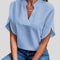 Blusa de Manga Corta a la Moda: Diseñada con un corte holgado y un elegante escote en V con detalle de cuello con abertura, esta blusa es una adición esencial para cualquier guardarropa.
