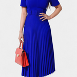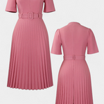 Un diseño profesional que une elegancia y funcionalidad. Seliora resalta con una cintura ceñida que perfila la silueta y un delicado cinturón que aporta definición, mientras los plisados de la falda añaden movimiento y refinamiento. Su corte midi y las mangas cortas lo convierten en una opción cómoda y versátil para la oficina y más allá.